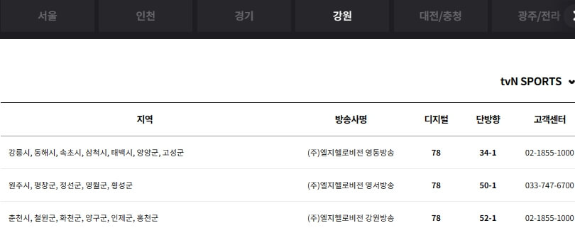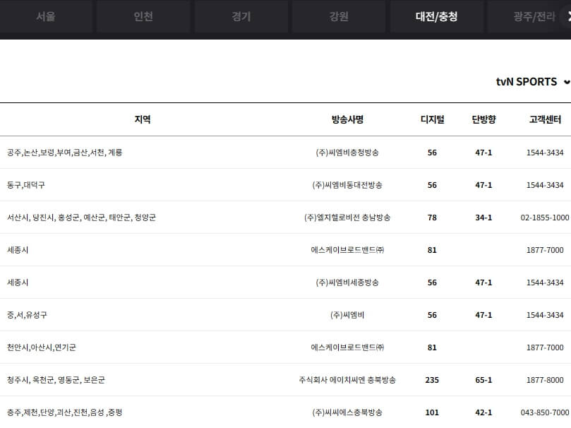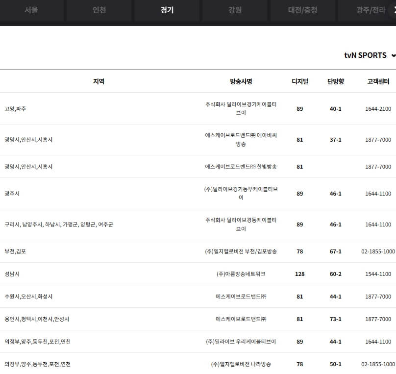 tvN sports 보실분들은 아래 통신사별, 지역 케이블 방송별 TV 채널번호와 고객센터 번호 및 편성표를 참고하시기 바랍니다.