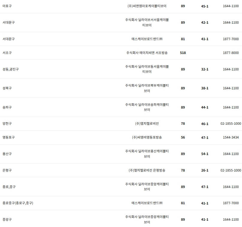 아래는 딜라이브, HCN, JCN, 서경방송, KCTV, 금강방송, 푸른방송, CMB, 남인천방송, 엘지헬로비전(헬로 TV), 아름방송 등의 지역 방송별 채널번호와 고객센터 번호입니다.