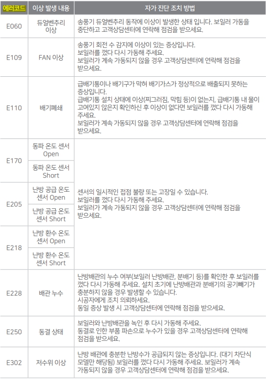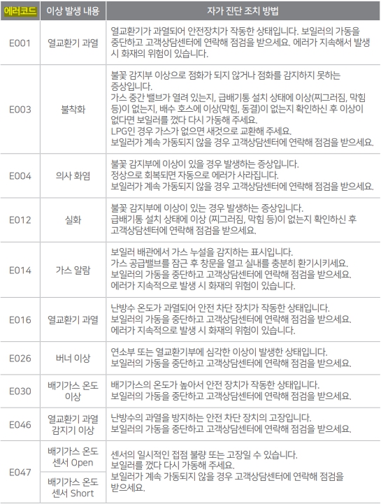 ✅ 아래의 안내서에 따라 에러 코드별 상세 이상내용을 확인하시고 보일러를 껐다가 다시 켜는 등의 조치를 취한 후 AS서비스 신청을 합니다. 사진을 누르면 크게 보실 수 있습니다.