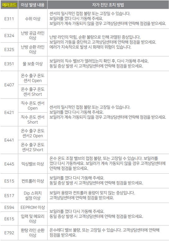 ✅ 아래의 안내서에 따라 에러 코드별 상세 이상내용을 확인하시고 보일러를 껐다가 다시 켜는 등의 조치를 취한 후 AS서비스 신청을 합니다. 사진을 누르면 크게 보실 수 있습니다.
