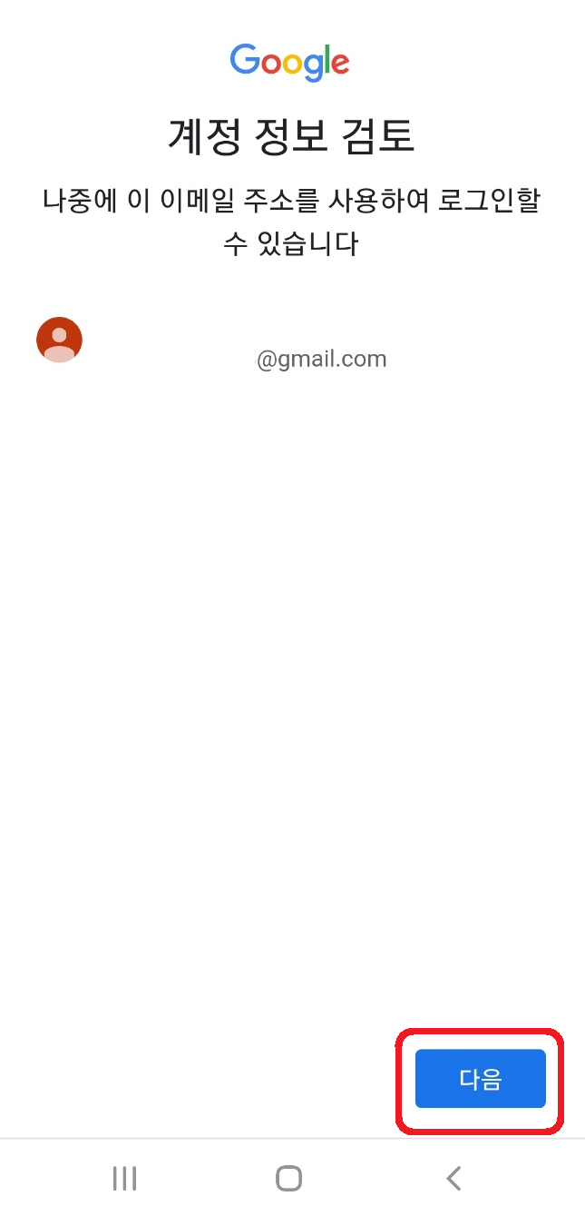 6. 계정 정보 검토 화면에 새로 만든 계정이 나타납니다. 지정한 아이디가 맞는지 확인 후 오른쪽 하단에 '다음'을 클릭합니다.