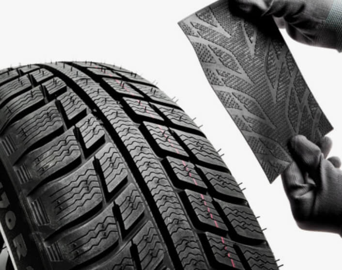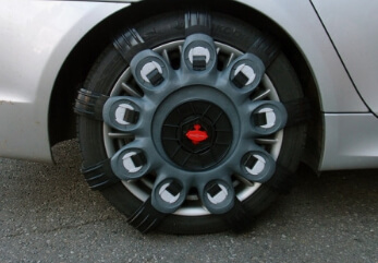 패턴이 있는 고무 각인으로 마찰력을 일으키는 패치를 스티커처럼 타이어 표면에 붙이는 형태입니다. 붙이고 10분 정도 굳는 시간이 필요합니다. 차량에 구비해 두었다가 갑자기 눈이 오거나 빙판길이 예상될 때 사용하면 좋습니다. 한계속도는 40km/h 정도입니다.