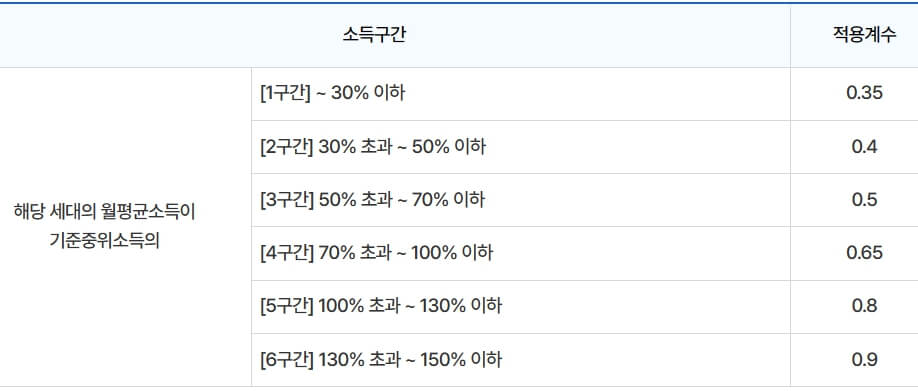 ✅ 소득구간계수: 해당세대의 월평균 소득의 기준중위소득 대비 소득구간에 따라 아래와 같이 적용계수가 결정됩니다. 따라서 소득 수준이 낮을수록 임대보증금과 임대료가 저렴해집니다.