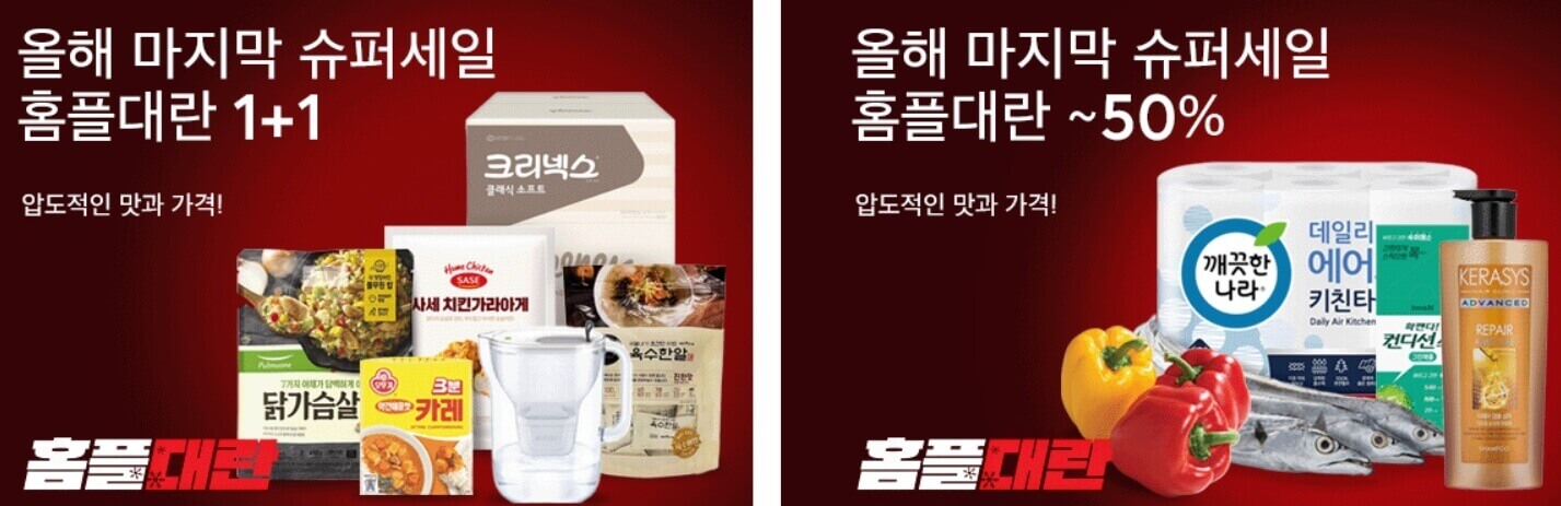 홈플러스에서는 12월에 홈플대란이라는 이름으로 대규모 할인 행사를 진행합니다. 할인, 쿠폰, 1+1 상품 등 다양한 혜택이 제공되니 내용을 확인하시고 이 기회에 저렴하게 구매하시기 바랍니다.
