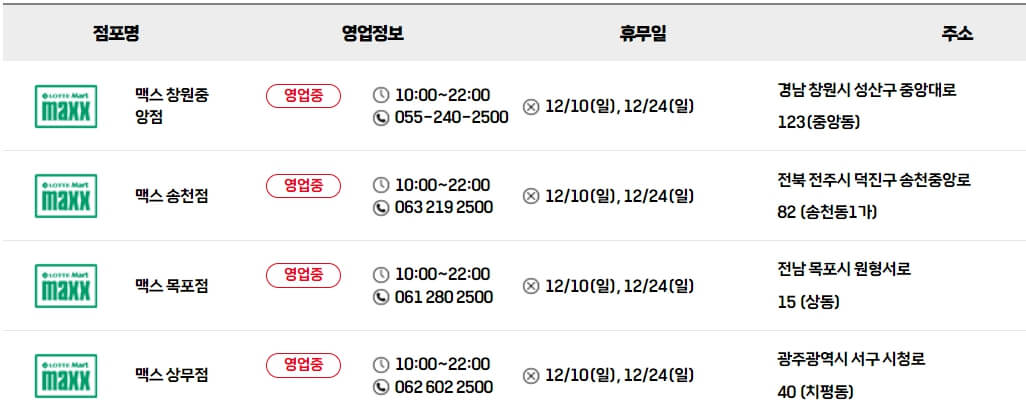 참고로 롯데마트에서도 이마트트레이더스처럼 창고형 할인마트가 있는 것 아시나요? 롯데마트 MAXX라고 현재는 4개 지점 (창원, 전주, 목포, 광주)에서 운영되고 있습니다. 이마트 맥스 지점과 영업시간, 휴무일 정보는 아래와 같습니다.