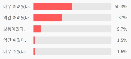 고2 학생들의 12월 모의고사 체험난이도는 매우 어려움 50.3%, 약간 어려움 37%, 보통 9.7%, 약간 쉬움 1.5, 매우 쉬움 1.6%로 조사되었습니다. 매우 어려움이 50% 이상으로 체감상 난이도가 매우 높았음을 알 수 있고 학생들이 매우 당황했을 것 같습니다.