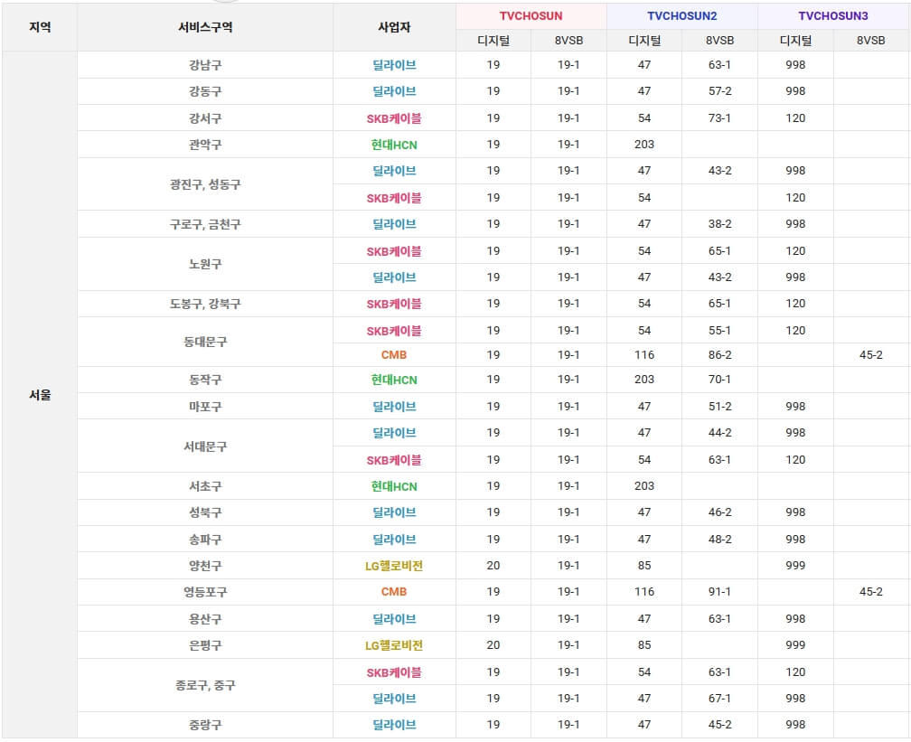 서울, 경기, 인천, 부산, 대구, 대전, 광주, 강원, 울산, 충북, 충남, 경북, 경남, 전북, 전남, 제주 지역별 딜라이브, SKB케이블, 현대 HCN, CMB, LG헬로비전, 아름방송, 남인천방송, 푸른 방송, JCN 울산중앙방송, CCS 충북방송, 하나방송, 서경방송, 금강방송, 제주방송 등 지역 케이블 방송사의 TV조선 (1, 2, 3) 채널번호는 아래에서 확인하실 수 있습니다.