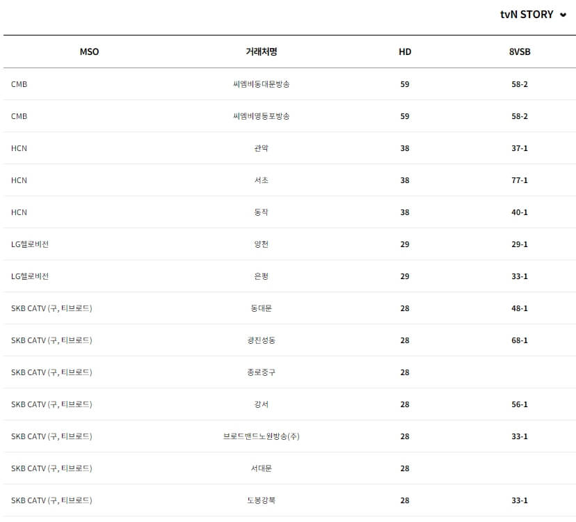 아래에서 지역별, 케이블 방송사별 tvN STORY 채널번호를 확인하실 수 있습니다. 지역 선택 후 사용 중인 케이블 방송사를 찾으시면 채널번호를 확인하실 수 있습니다.