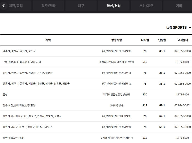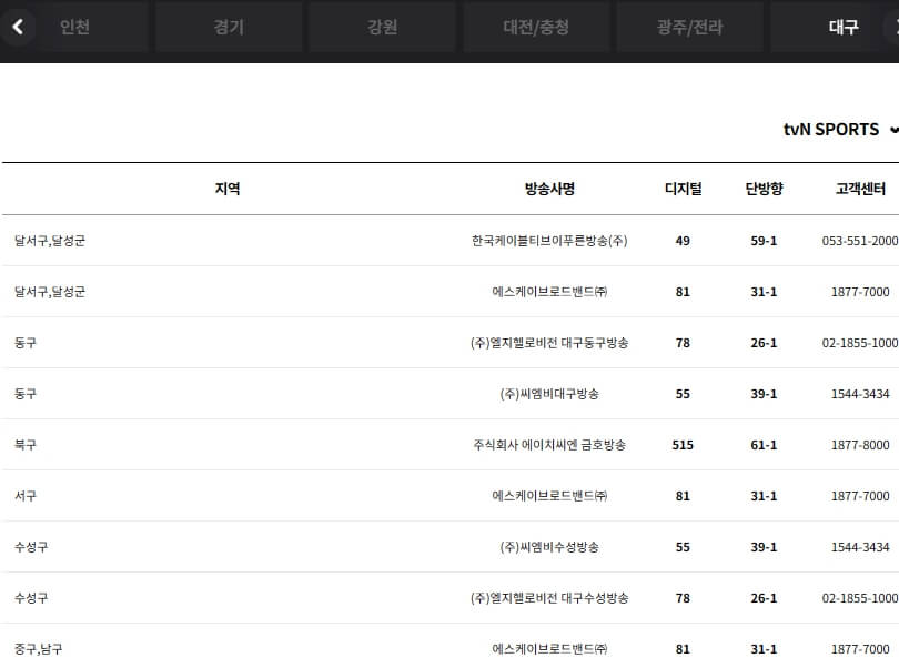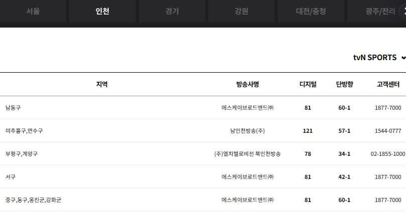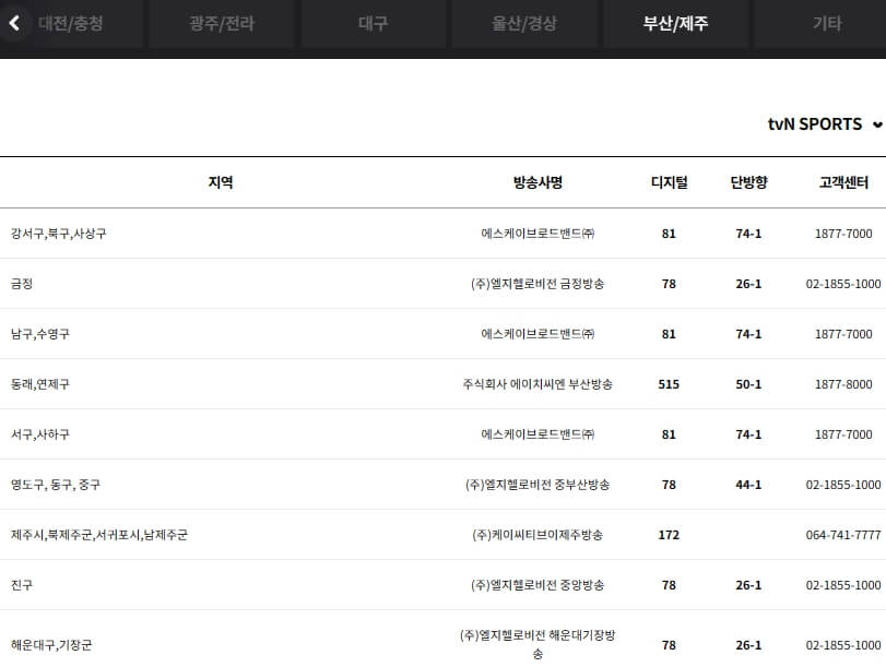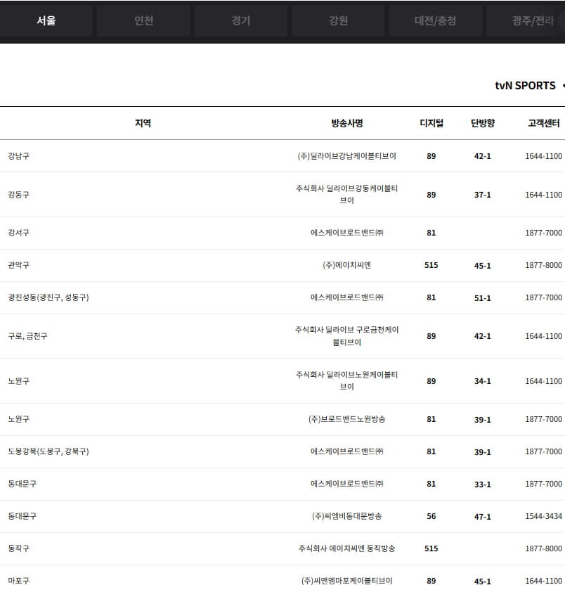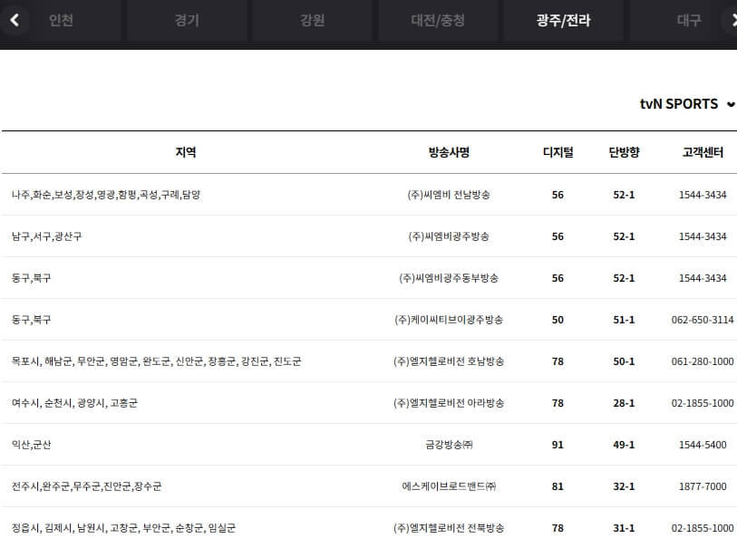 tvN sports 보실분들은 아래 통신사별, 지역 케이블 방송별 TV 채널번호와 고객센터 번호 및 편성표를 참고하시기 바랍니다.